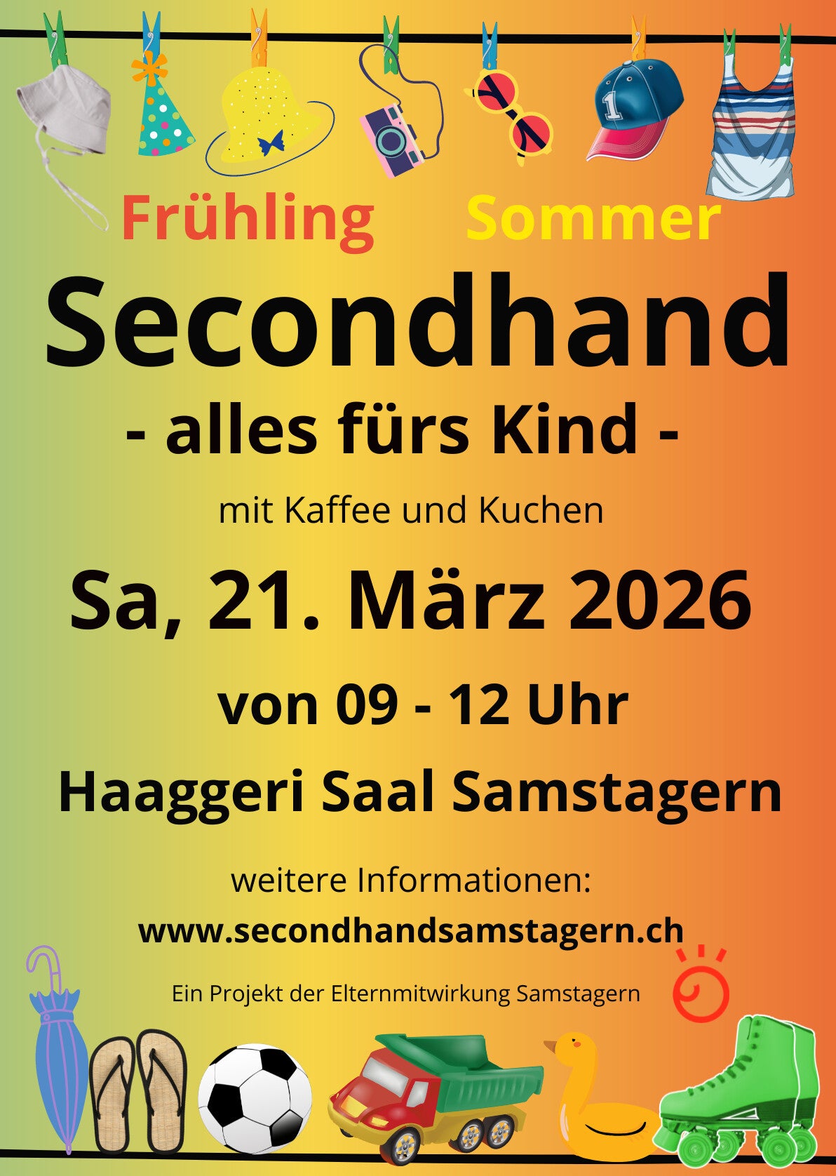 Auf dem "Secondhand - alles fürs Kind" werden gebrauchte aber gut erhaltene Spielsachen, Kleidungsstücke und Sportartikel für Kinder günstig angeboten. Im Frühling gibt es hauptsächlich Sommerartikel, im Herbst ist das Angebot der kalten Jahreszeit angepasst. Der Anlass dient Eltern dazu, ihre Kinder für wenig Geld mit vielen "neuen" Sachen für die kommende Saison auszustatten, oder andersrum, um nicht mehr gebrauchte Kinderartikel sinnvoll weiterzugeben.